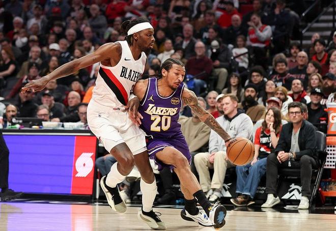 本场比赛,双方在首发阵容上面,湖人这边派出的是,八村塁,艾顿,拉拉维亚,斯马特,克内克特。开拓者这边派出的是,阿夫迪亚,霍勒迪,夏普,卡马拉和克林根。首节比赛开始,湖人第一攻,斯马特借掩护突破飞身上篮,打进本场比赛首个进球;艾顿罚球线处急停跳投同样也有,霍勒迪大步流星杀进内线为开拓者开张。